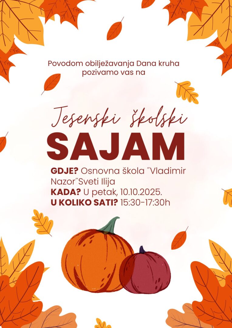 Učenička zadruga ˝Beletinček˝, poziva Vas na Jesenski školski sajam povodom obilježavanja Dana kruha koji će se održati u petak 10. listopada 2025. Sajam će se održati od 15:30h do 17:30h na školskom igralištu Osnovne škole ˝Vladimir Nazor˝ Sveti Ilija.