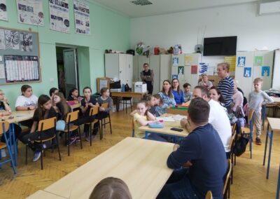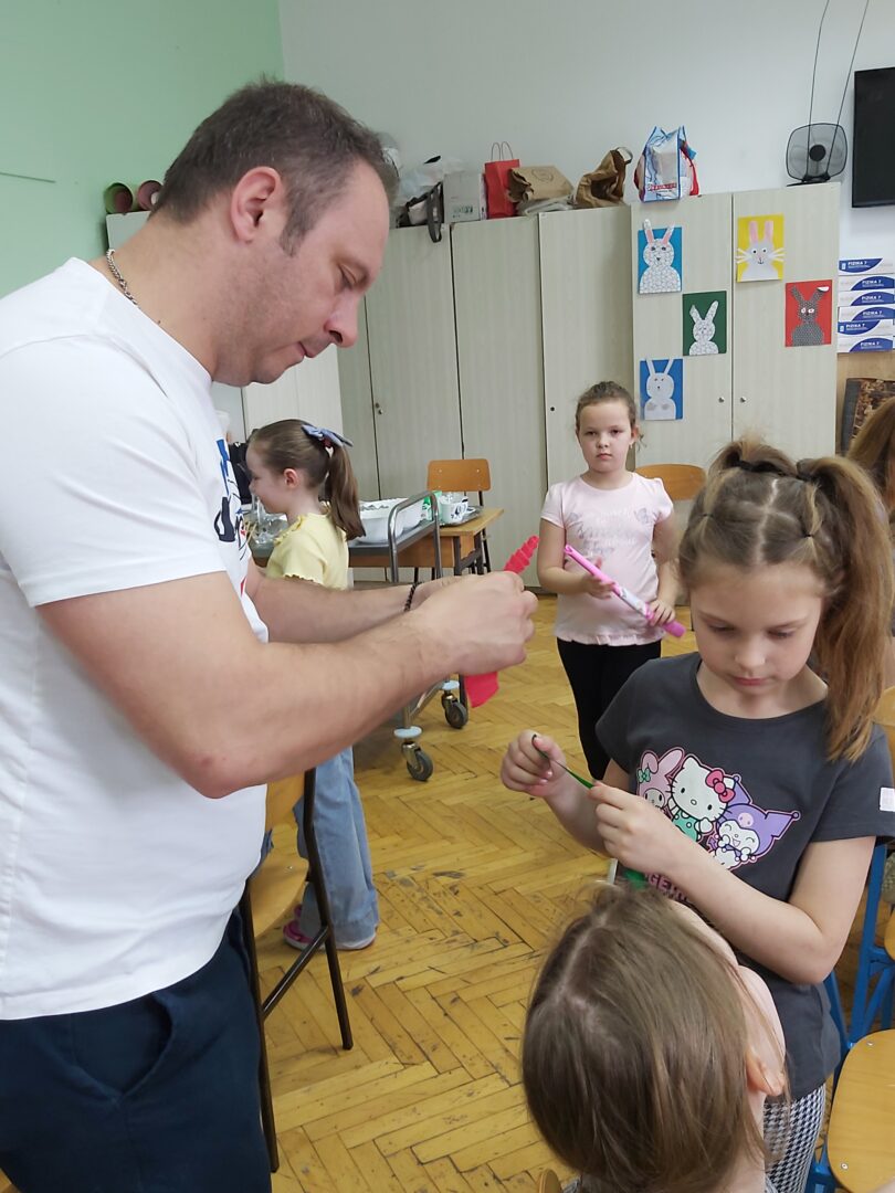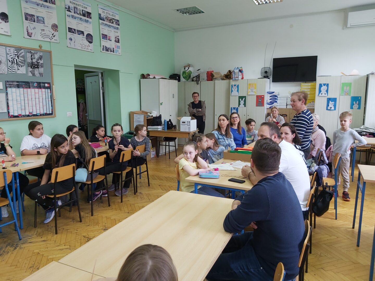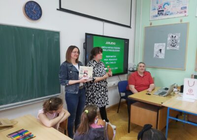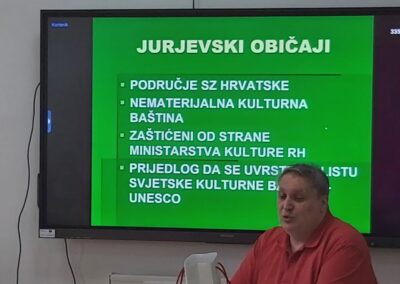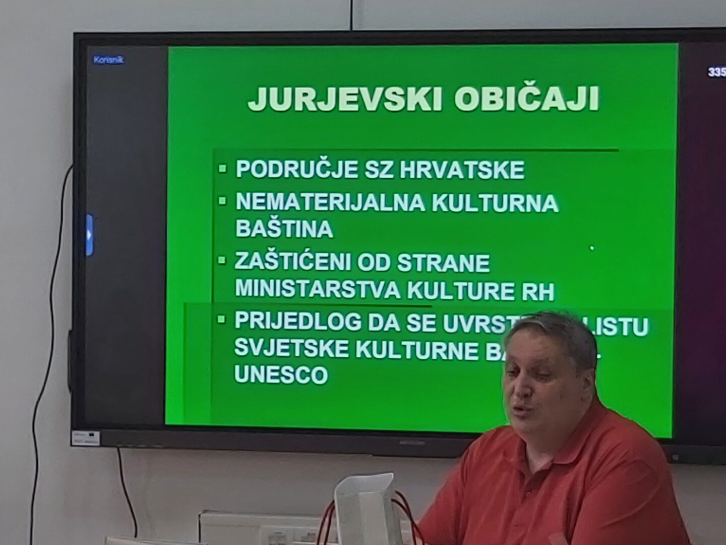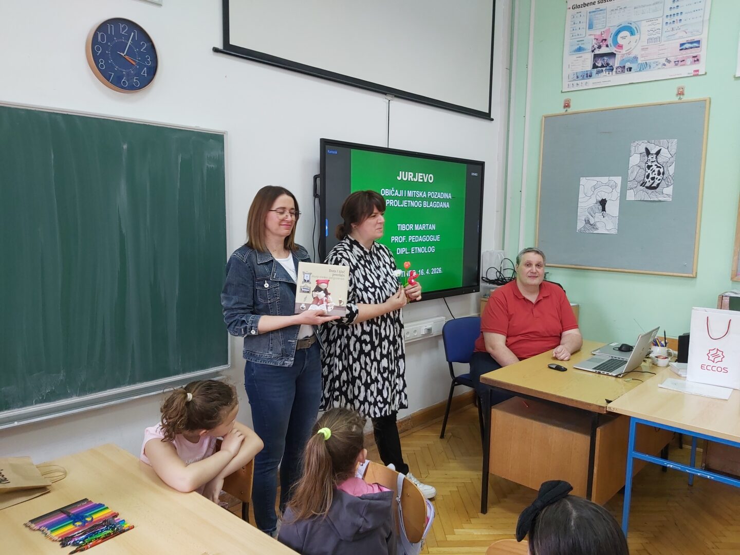 Ovoga puta ugostili smo etnologa gospodina Tibora Martana, koji je učenicima i sudionicima predstavio svoju slikovnicu na kajkavštini „Dora i kinč povedaju Jurjevsku pripovest“. Kroz zanimljivo i poučno izlaganje, gost nas je uveo u svijet tradicije i običaja vezanih uz Jurjevo: običajne radnje prije Jurjeva, blagoslov polja, jurjevski krijes, čestitarski ophodi, umivanje i pranje, izgon „blaga“ na pašu i kićenje zelenilom. Poseban naglasak stavio je na jurjevske običaje opisane u slikovnici, približivši sudionicima bogatstvo kulturne baštine na pristupačan i živopisan način.