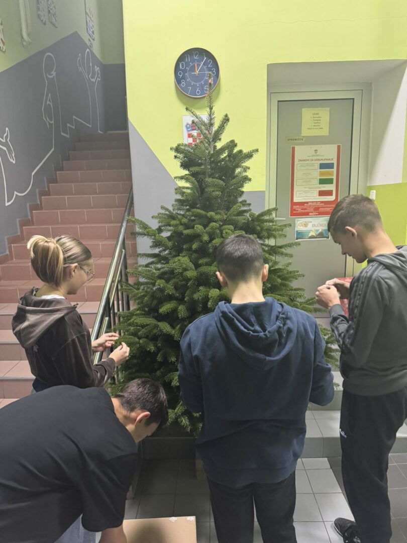 Božićno drvce sada ponosno krasi hodnik škole, stvarajući toplo i svečano ozračje za sve učenike, djelatnike i posjetitelje koji prolaze školom.