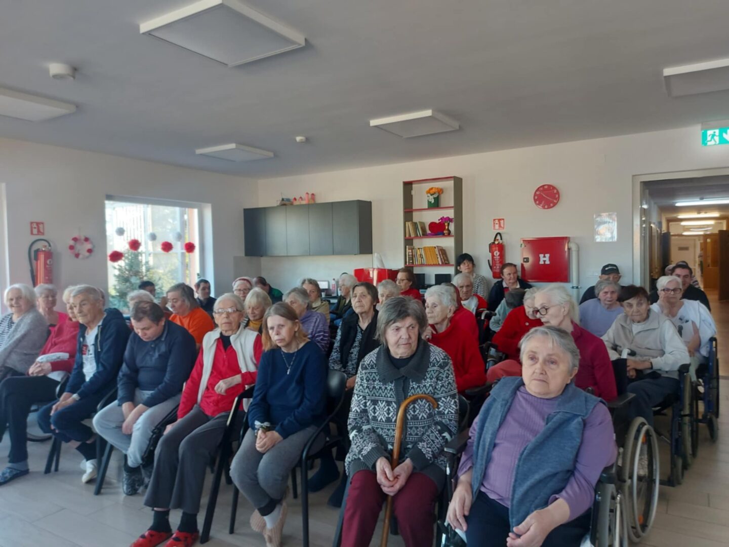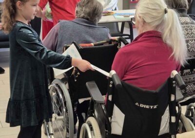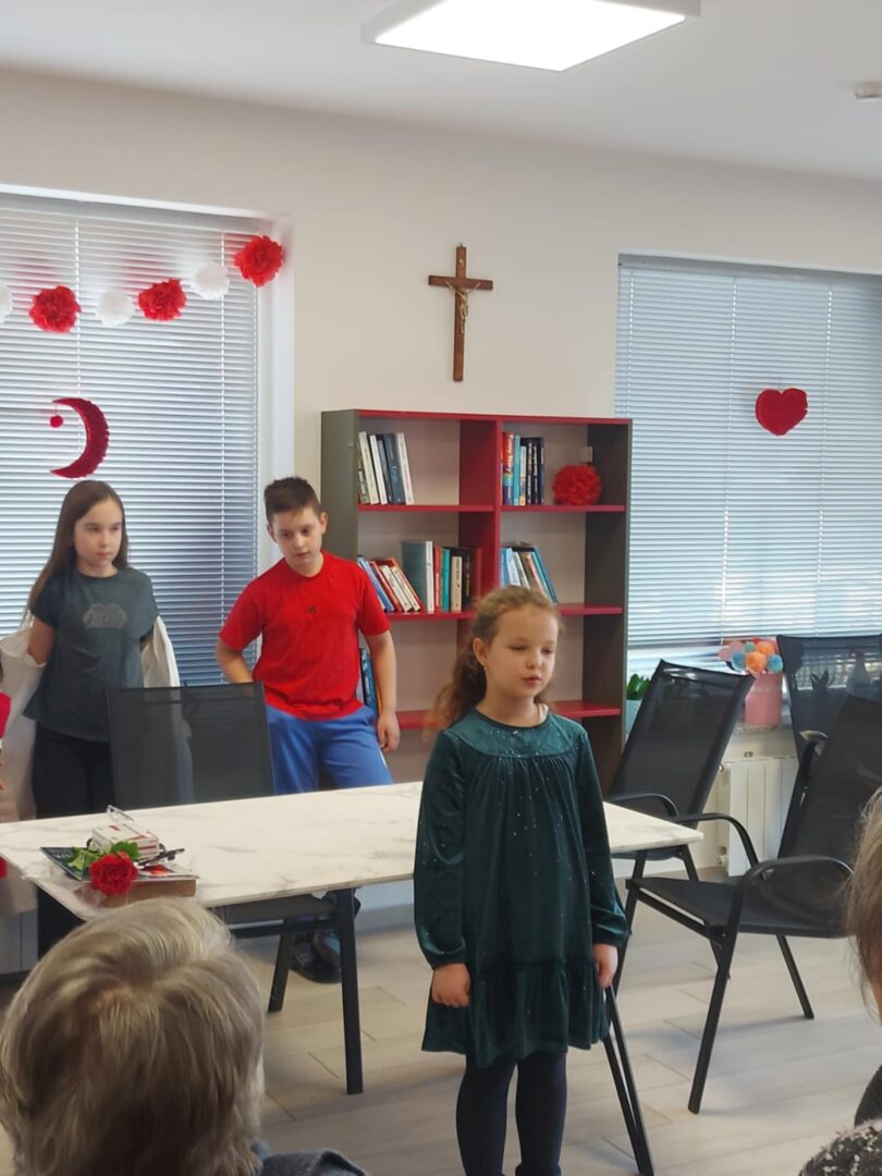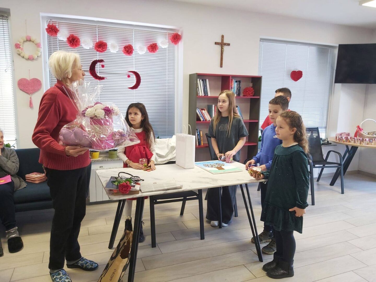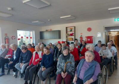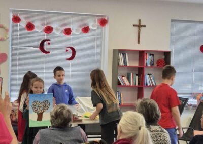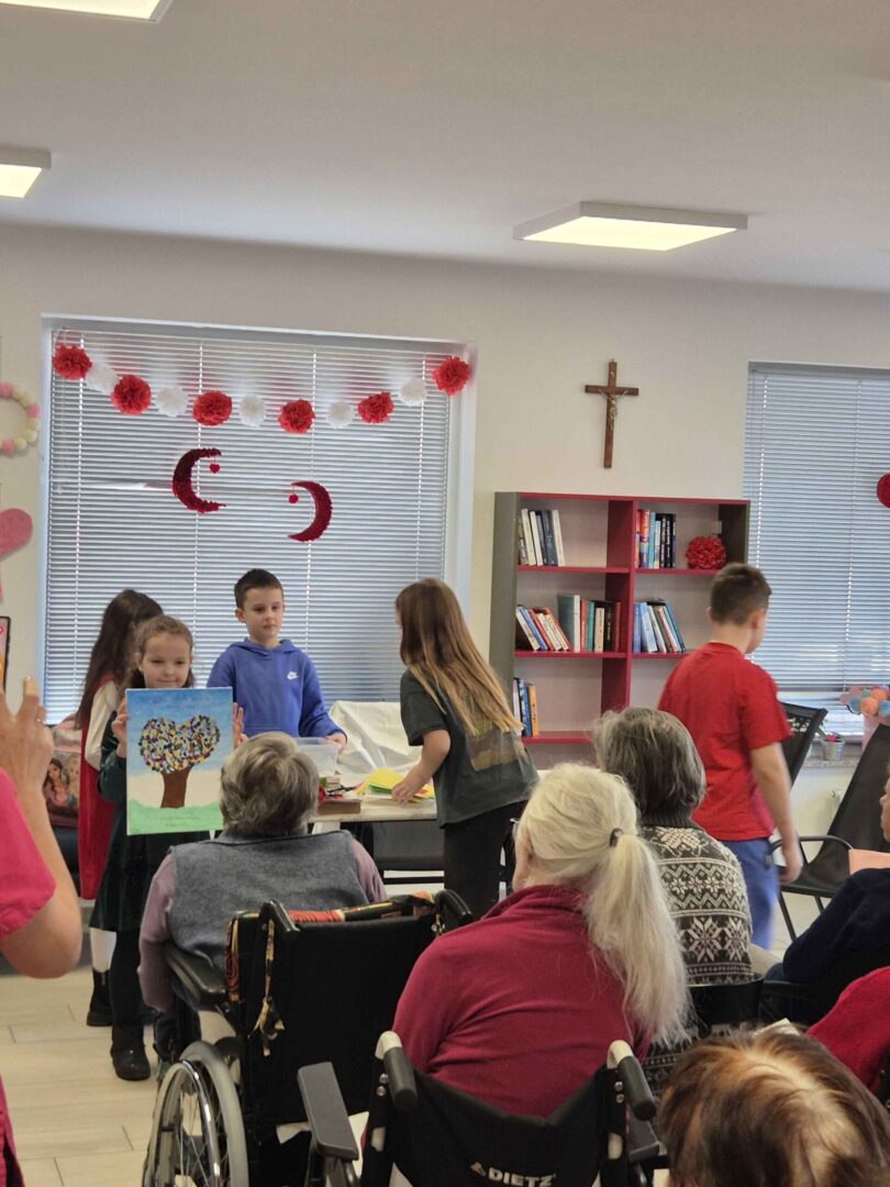 Vrhunac akcije bio je posjet domu 18. veljače 2026. godine. Naši su učenici, u pratnji ravnateljice škole Nataše Fadige i učiteljice Ivane Banić, u domu bili srdačno dočekani. Prigodnim programom, toplim riječima i osobnim uručenjem čestitki uspjeli su razveseliti korisnike doma i unijeti vedrinu u njihovu svakodnevicu. Susret je protekao u ozračju međugeneracijskog zajedništva, razgovora i osmijeha.