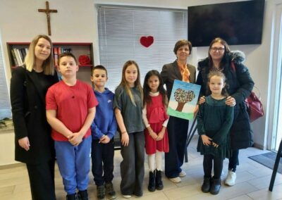 Posebno dirljiv trenutak bila je razmjena poklona – učenici su domu uručili likovni rad kao trajnu uspomenu na susret, a štićenici doma i djelatnici uzvratili su znakom pažnje i zahvalnosti našim malim volonterima. Također, predstavnici Crvenog križa uručili su učenicima zahvalnicu za iskazanu humanost i doprinos zajednici.