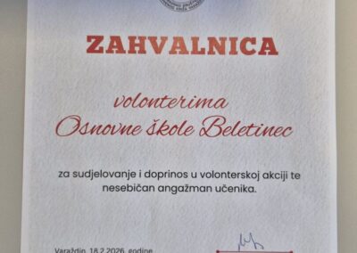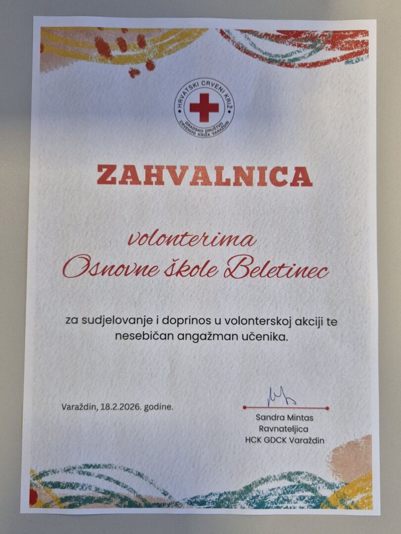 Povodom Svjetskog dana bolesnika, u suradnji s Gradskim društvom Crvenog križa Varaždin, učenici produženog boravka OŠ Beletinec zajedno sa svojim roditeljima uključili su se u volontersku akciju izrade čestitki s porukama podrške za starije i nemoćne osobe.